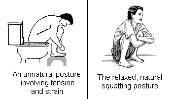 - Bagi mereka yang masih tidak selesa menggunakan tandas cangkung, saya mencadangkan agar duduk di tandas duduk tetapi memastikan posisi lutut lebih tinggi daripada paha. Ia boleh dilakukan dengan meletakkan kaki di atas bangku yang rendah di hadapan tandas duduk ini. Ini akan menyebabkan posisi lutut akan menjadi lebih tinggi.